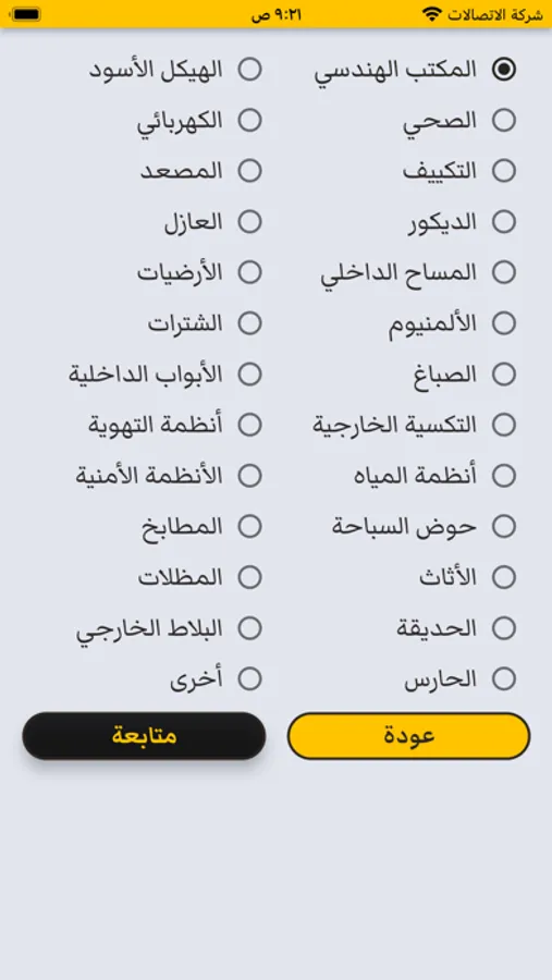 - إنشاء عقود مع تحديد نوع البند (صحي، كهربائي، هيكل أسود)