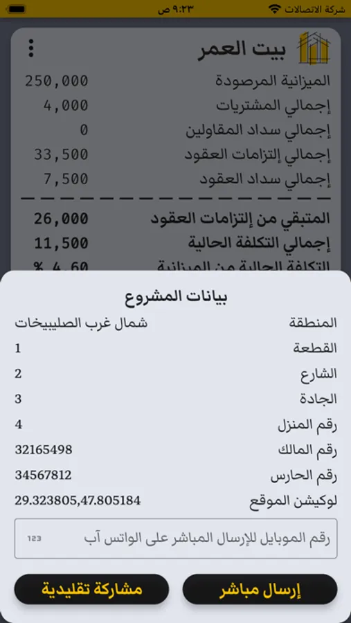 - يمكنك مشاركة بيانات موقع المشروع مع المحلات التجارية من خلال التطبيق مباشرة
