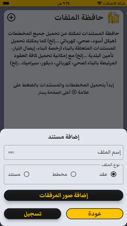 - يمكنك تحميل كافة العقود، والمخططات، والمستندات المرتبطة بالمشروع والرجوع لها لاحقا