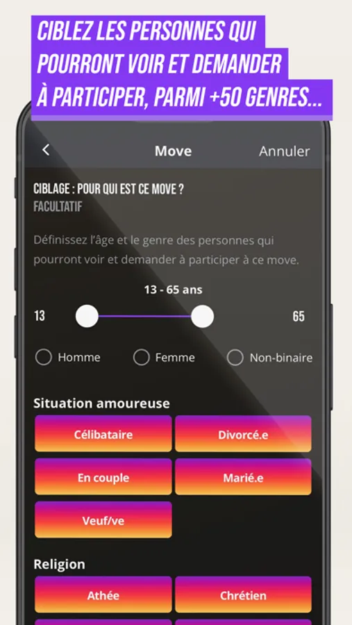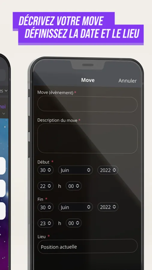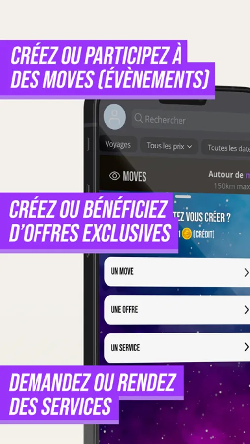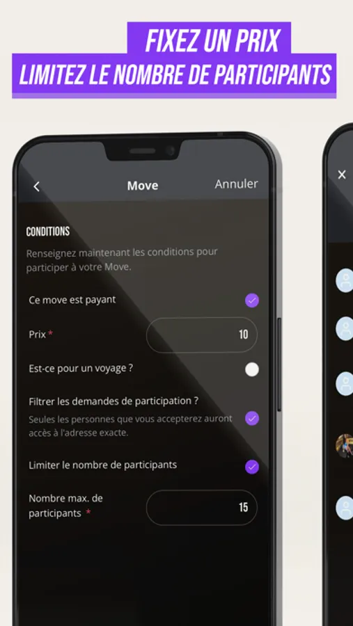 Chaque utilisateurs peut créer son Move* (événement), et sélectionner le « genre » de personnes qui pourront y participer.
