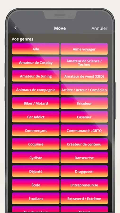 A ton inscription, sélectionne un max de genres qui te représente pour avoir accès à un max de Move dans ton fil d’actualité !
