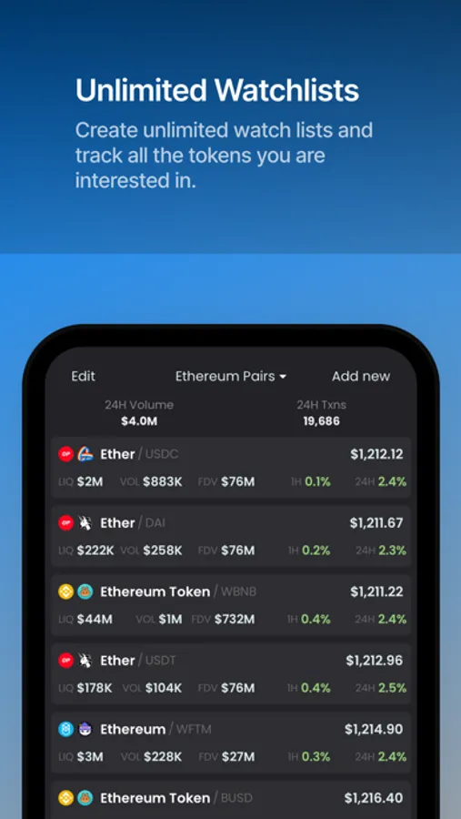 - Customizable screeners with several metrics such as volume, price change, liquidity and market cap