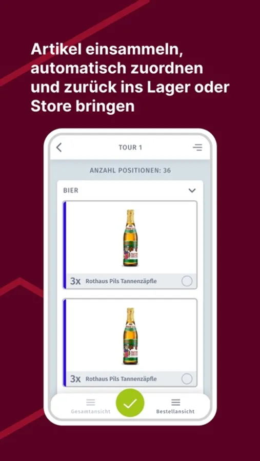 Die einfache Hilfe für die Kommissionierung deiner Waren beinhaltet auch die Sortierung der Artikel nach Warengruppen, inkl. Bildern und Barcodescanner zur eindeutigen Identifikation der einzusammelnden Artikel. Darüber hinaus hat die SIDES Pick-App eine Kontrollfunktionen für den Pfand, den ein Fahrer bei seinen Kund:innen eingesammelt hat.