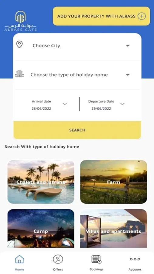 Al Rass Gate is a platform licensed by the Ministry of Tourism for shared housing and enabling individuals to rent places owned by other individuals such as (apartments, villas, chalets, farms, rest houses, resorts, camps, caravans and other holiday homes)