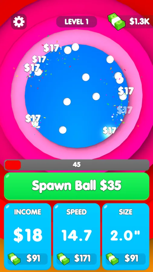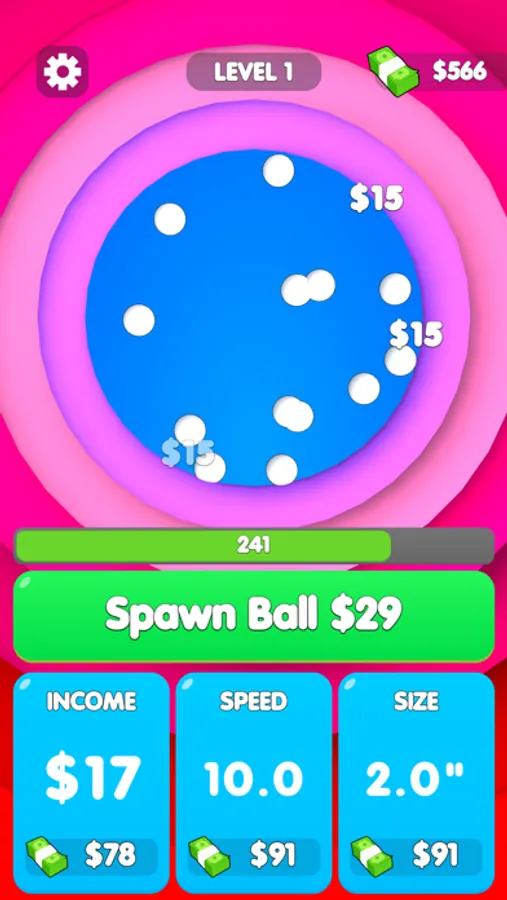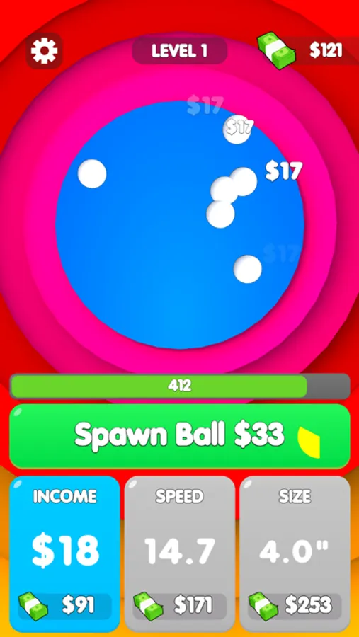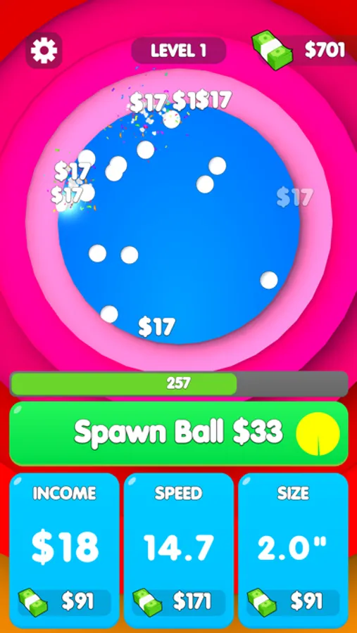Spawn balls to destroy all rings. Upgrade your ball count, ball speed and your income per ring.