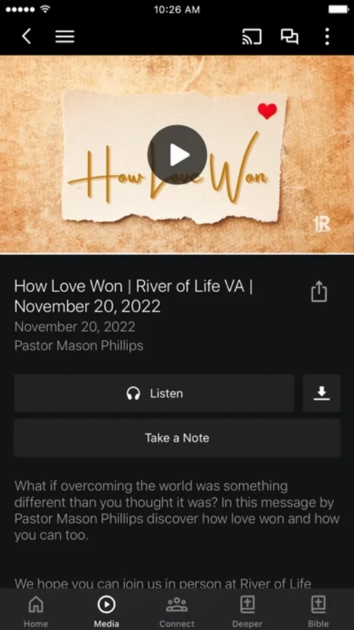 This app will help you stay connected with the day-to-day life of River of Life Church in Dumfries, VA. With this app you can: watch or listen to past messages; stay up to date with push notifications; share your favorite messages via Twitter, Facebook, or email; and download messages for offline listening.