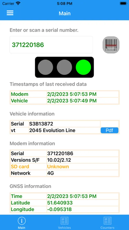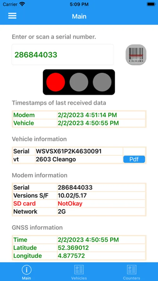 With this app mechanics/support can check if the RTCU is configured OK and if it is in good working order. Information is provided about vehicle type, connected vehicle, SD-card status, connection to server etc.