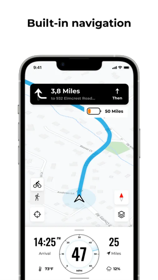 Dashboard Metrics. Your ebike’s Dashboard in this bike tracker will estimate how many miles, and how much battery power, is left until you need to recharge. It will also display how fast you're going (it has a built-in bike speedometer), the number of miles completed during your ride, the status of connection to your bike alarm, and metrics associated with the Battery Management System. Lock and unlock your bike with one easy click.