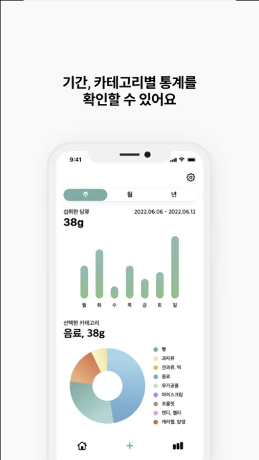통계기능을 활용하면 설탕 섭취량을 쉽게 확인할 수 있어요.