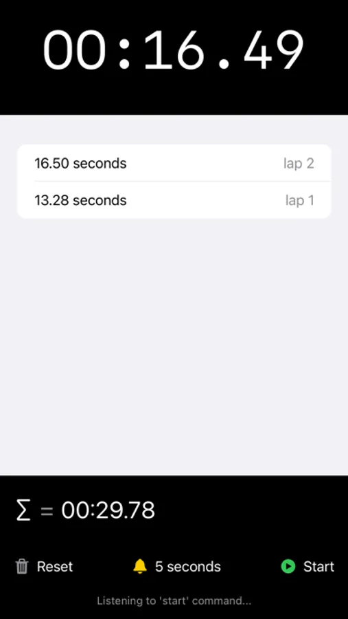 It supports the following voice commands: "start", "stop" and "time".