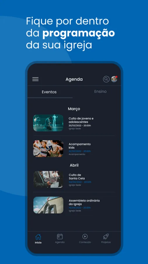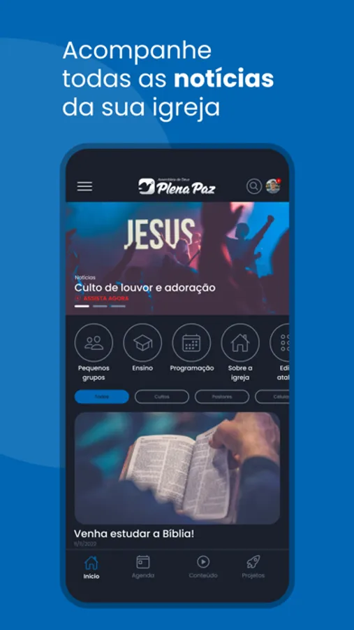 Recursos disponíveis no Aplicativo: Notícias, Agenda da igreja, Eventos, Conteúdos, Projetos, Transmissão ao Vivo e Módulo Ensino.