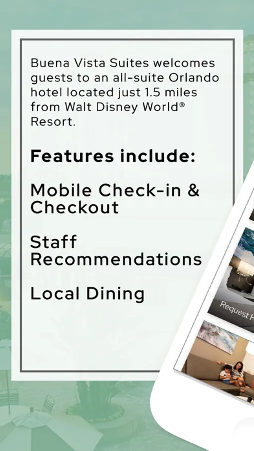 Welcome to the Buena Vista Suites’ Digital Guest Experience app, connecting you to a wealth of information and services available conveniently on your mobile device to seamlessly guide your journey at Buena Vista Suites Orlando. Communicate with our team via chat, view restaurant menus, check out the Disney shuttle schedule or access the resort services directory – whether you are on property or exploring the theme parks – it’s all at your fingertips.