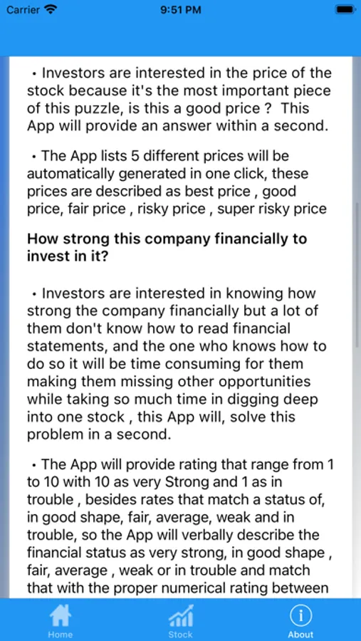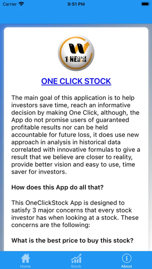 The main goal of this application is to help investors save time, reach an informative decision by making One Click, although, the App do not promise users of guaranteed profitable results nor can be held accountable for future loss, it does use new approach in analyzing historical data correlated with innovative formulas to give a result that we believe are closer to reality, provide better vision and easy to use, time saver for investors