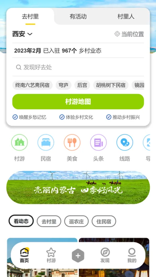 “去村里APP”是专注乡村旅游的垂直类平台服务商。为游客解决乡村旅游出行指南,为乡村旅游经营者解决营销渠道,提供“乡村特色旅游、乡村露营民宿、乡村康养旅居、乡村农特产土货、乡村主题活动”等数字信息服务,助推国家乡村振兴,赋能乡村旅游发展,逐步实现“一部手机,村游中国”的惠民目标。