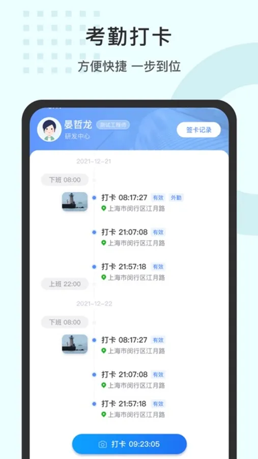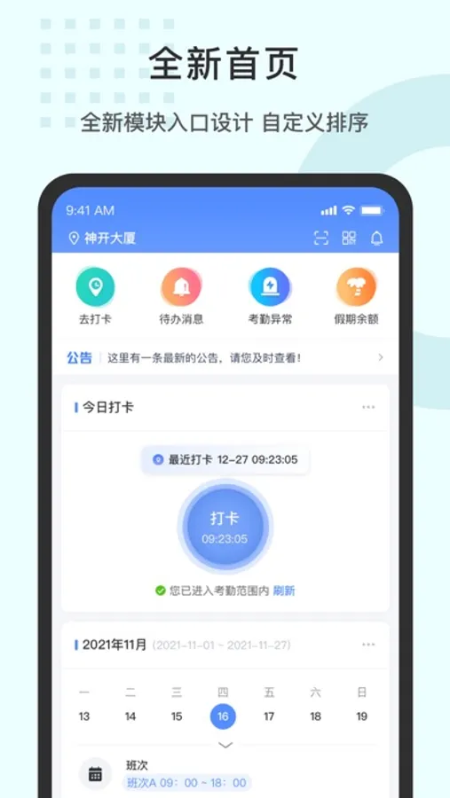 2.员工打卡,支持考勤机、门禁、GPS、蓝牙、Wi-Fi、二维码多种打卡方式;