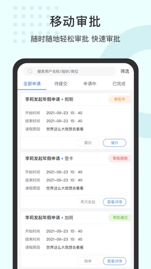 3.员工请假、差勤、加班、补卡、入职、等多种申请、审批;其中的假期政策库帮助企业HR解决各地假期差异问题;
