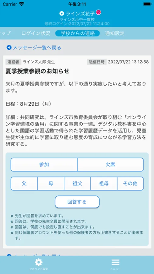 ・学校から保護者宛(全校・学年単位・クラス単位)の連絡をうけとることができます。回答をもとめられる連絡は、保護者にて回答を選択します。