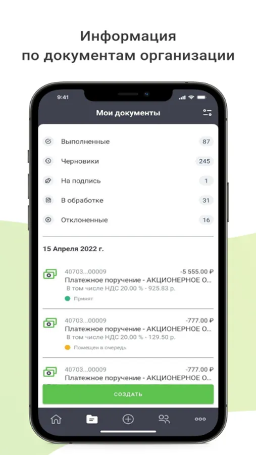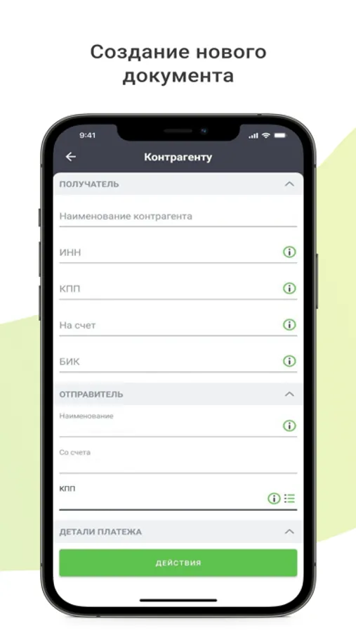 – Возможность отправки платежных поручений внутри приложения;