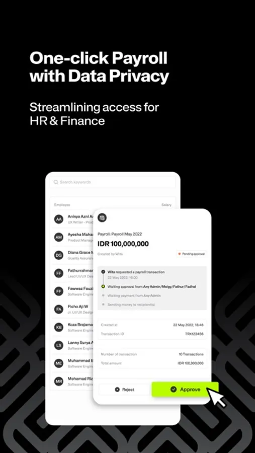 - One-click payroll with data privacy that streamlines Access for HR & Finance