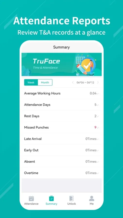 3、Statistics of user average working hours, daily attendance, missing punches, early out, absent, overtime and other attendance data by week and month.
