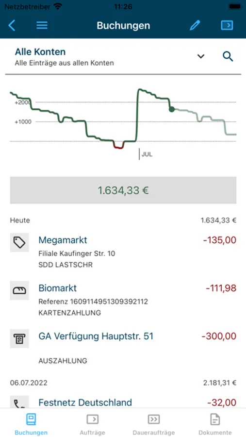 • Saldo, Umsätze, Überweisung, Terminaufträge, Daueraufträge, Lastschriften