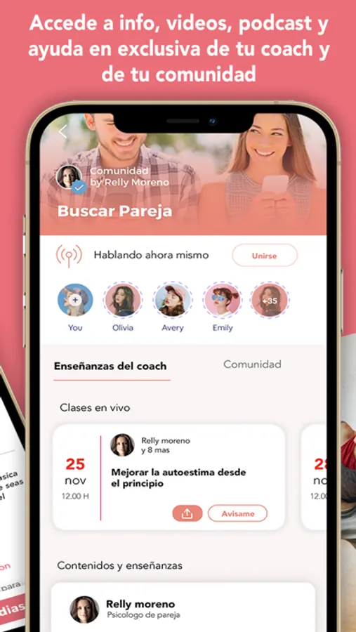 -Unirte a comunidades de ayuda formadas por usuarios que están en tu misma situación. Recibe ayuda e información exclusiva del coach líder de la comunidad y ten un espacio donde hacer networking y relaciones con otros usuarios en tu mismo estado.