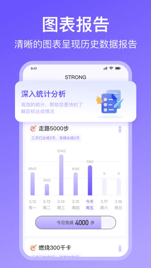 StrongSteps是一款可自动记录您每日的行走步数,燃烧的卡路里,步行距离,持续时间,步速,健康数据等,并以直观清晰的图表呈现,方便您随时查看。
