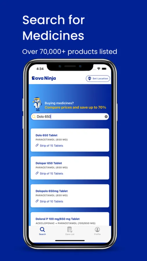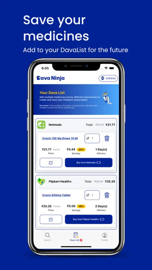 DavaNinja is a free app to compare medicine prices. All orders must be placed directly on 3rd party websites. DavaNinja does not sell medicines directly. DavaNinja does not claim to own any information on our platform or from pharmacies that are separate legal entities. DavaNinja does not replace your relationship with a physician and our platform and information is not a substitute for medical advice from a health care practitioner.