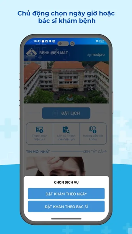 BV Mắt - Đặt lịch khám bệnh là một phần mềm đăng ký khám bệnh trực tuyến tại Bệnh viện Mắt. Thông qua ứng dụng bệnh nhân có thể: Đăng ký khám bệnh, Thanh toán tiền khám, Nhận phiếu khám bệnh, Tạo hồ sơ bệnh nhân, Quản lý hồ sơ bệnh nhân, Quản lý phiếu khám bệnh, Tư vấn sàng lọc bệnh… hoàn toàn trực tuyến ở mọi lúc mọi nơi mà không cần phải đến bệnh viện để xếp hàng và chờ đợi.