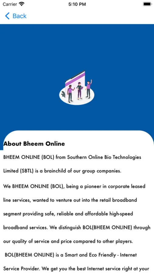 About page We BHEEM ONLINE (BOL), being a pioneer in corporate leased line services, wanted to venture out into the retail broadband segment providing safe, reliable, and affordable high-speed broadband services. We distinguish BOL(BHEEM ONLINE) through our quality of service and price compared to other players.