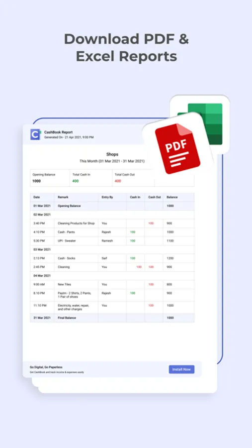 Cash Book is your free digital account book. Add transactions daily to record all debit and credit entries of your business. Add detailed entries with Category & Payment Mode.