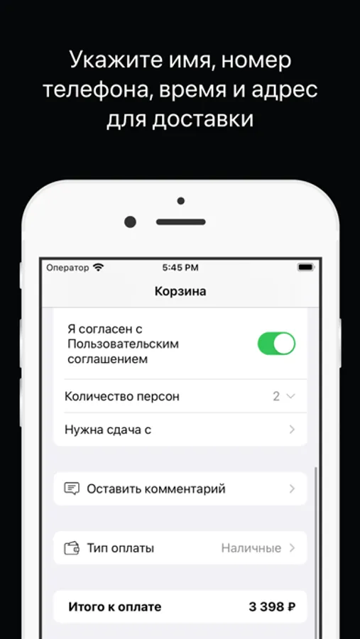 На экране заказа добавьте свою контактную информацию для первого заказа: Имя, Номер телефона и адрес электронной почты, чтобы получать уведомления об оплате.