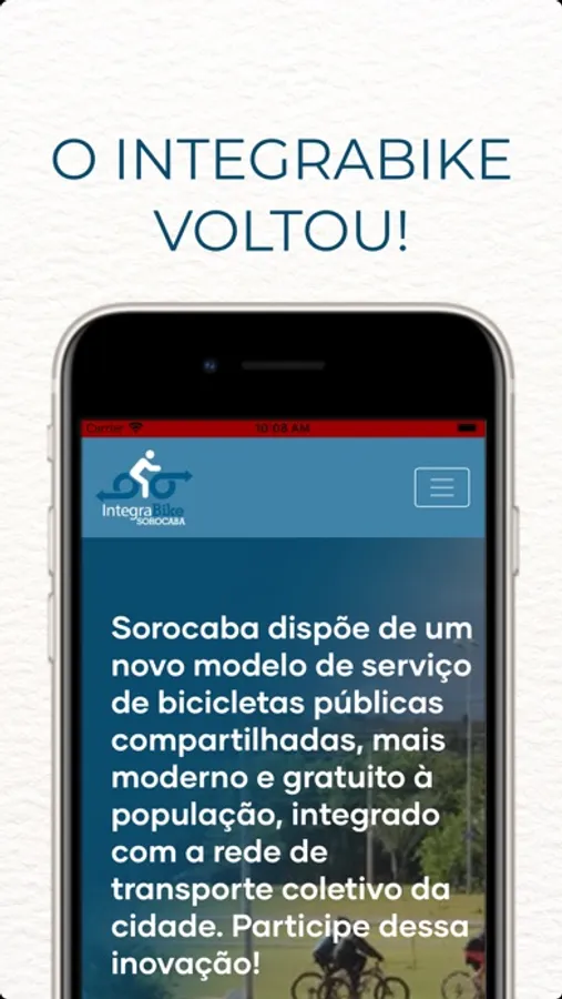 Com esse aplicativo você poderá realizar o seu cadastro fornecendo alguns dados pessoais necessários para o bom funcionamento da operação. Após esse registro e análise de seus documentos, será possível retirar bicicletas nas estações espalhadas pela cidade de Sorocaba utilizando seu cartão de transporte ou seu número de CPF e uma senha cadastrada.