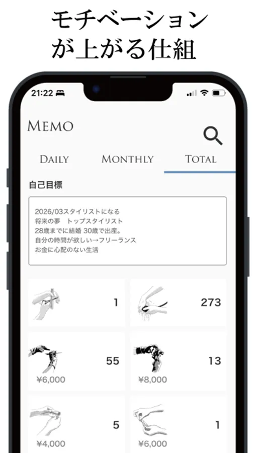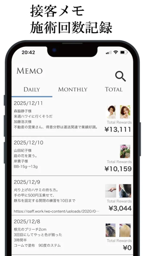 シャンプーやパーマなどの施術回数を、月毎と総数で確認することができます。