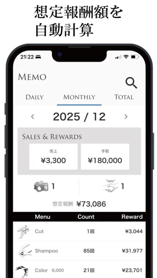 施術メニュー、工数、歩合率のかけ合わせにより、フリーランス美容師やアシスタントの想定報酬額を算出します。