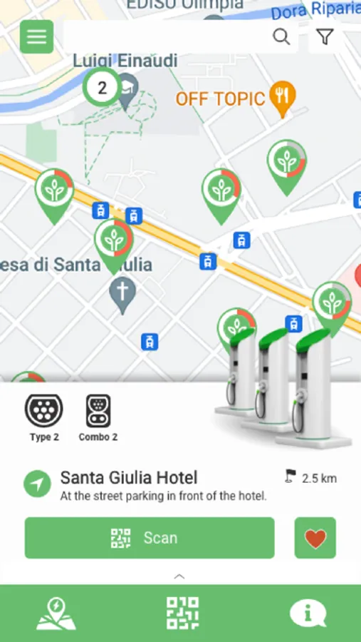 a portata di mano la mappa con i punti di ricarica, la distanza ed i tempi di