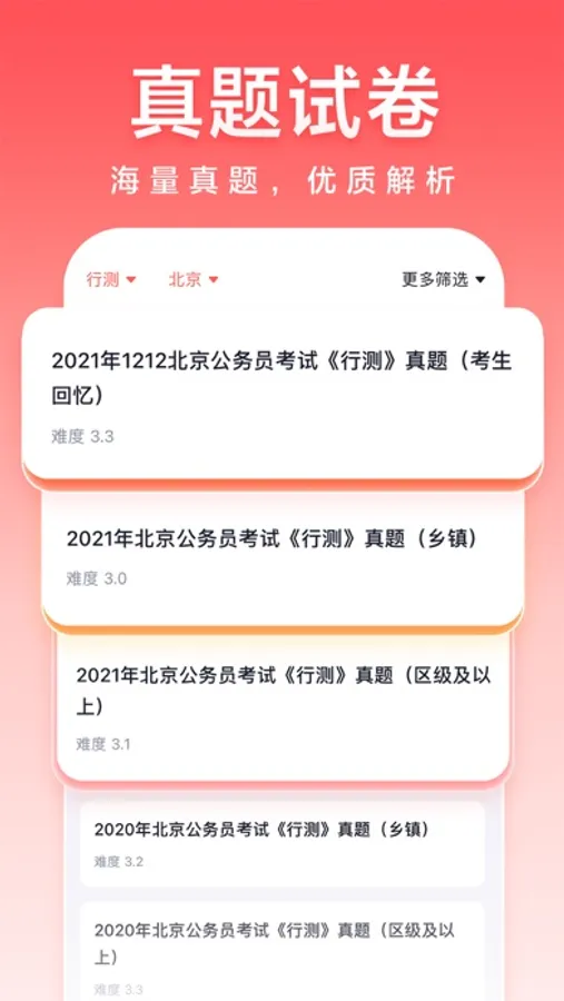 【练】多种模式,应有尽有。「真题试卷」涵盖公务员、事业单位近十年真题,助你了解历年考情,还原真实考场;「定制练习」匹配你当前能力等级的专属题库,告别题海战术,提高刷题效率,助你高效提分;「专项练习」分知识点刷题,供你挑选薄弱知识点进行练习,帮你重点突破,刷题更有方向。