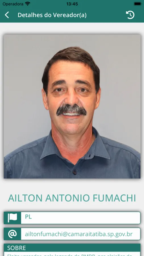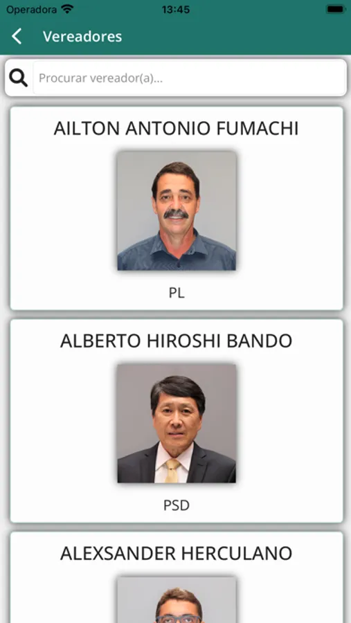 • Consulta a listagem dos Vereadores em exercício, exibindo o nome, partido, e-mail, telefone, links para proposituras apresentadas, frequência nas sessões e votos nominais;