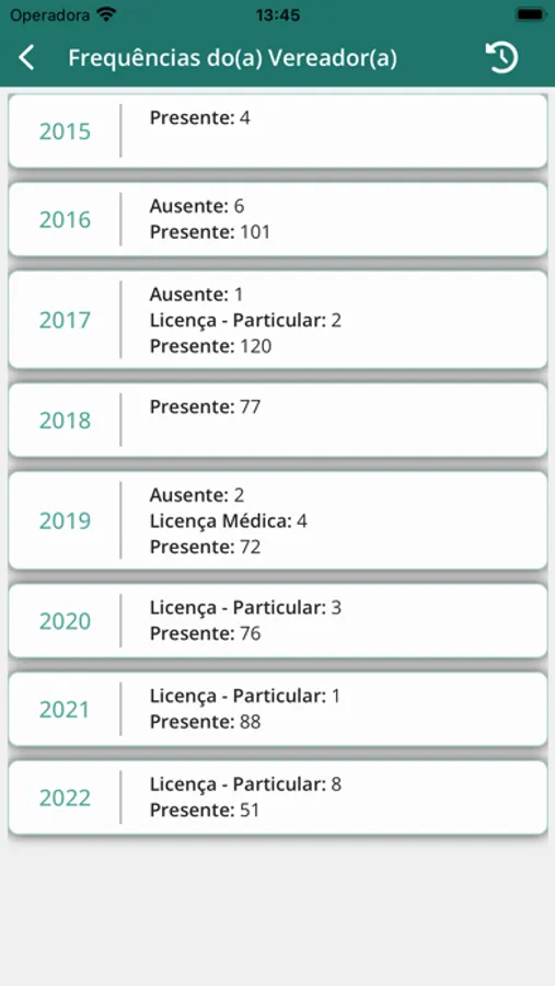 • Consulta a Frequência de Vereadores, com as presenças, ausências, falta justificadas e licenças, exibindo a data/hora, número e tipo da sessão.