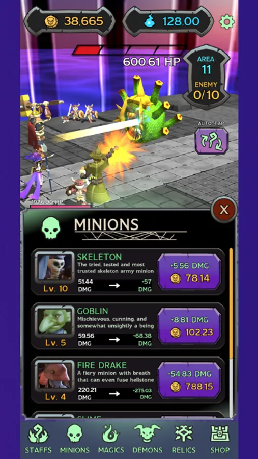 Upgrade staffs to gain higher base attacks. Raise minions such as the Skeleton, Goblin and Drake from the far depths.