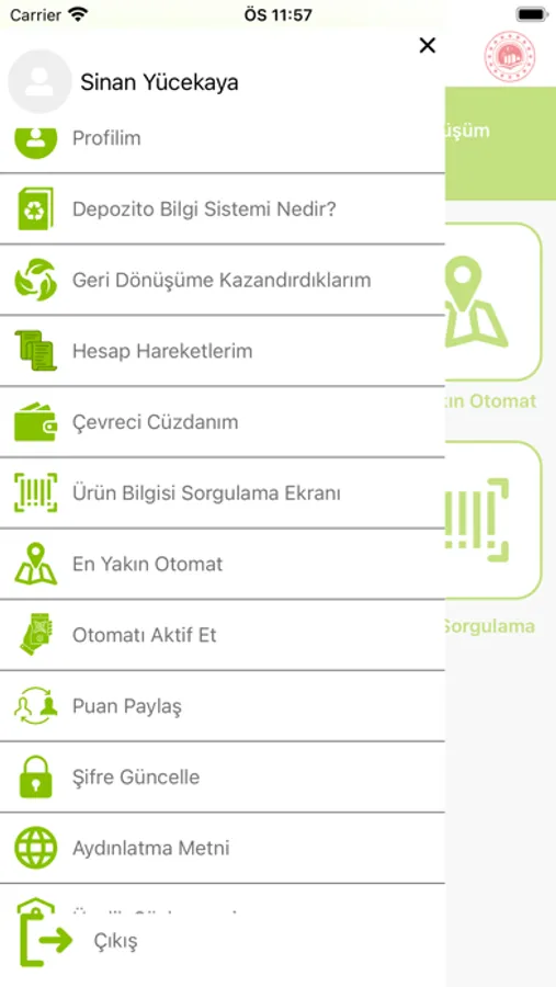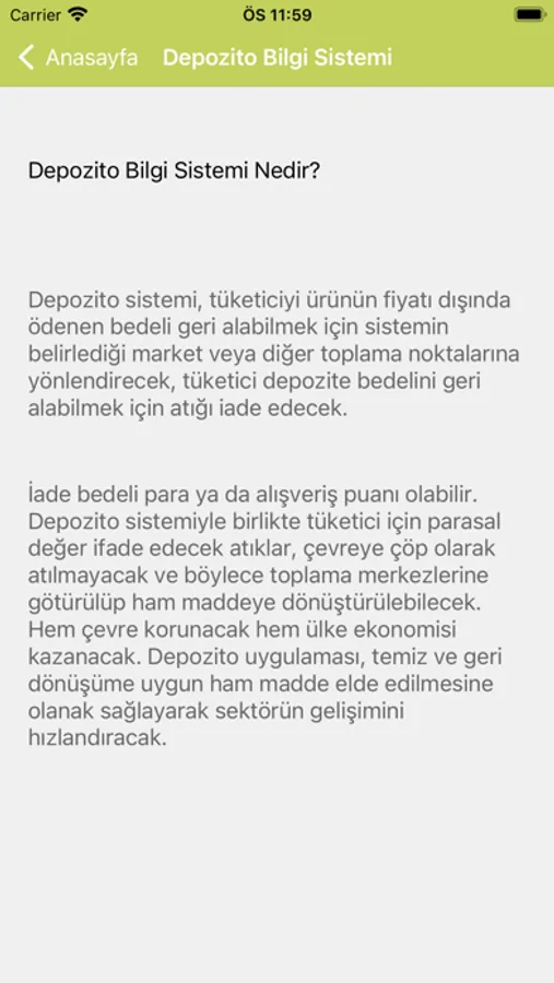 Çevre, Şehircilik ve İklim Değişikliği Bakanlığı Depozito Bilgi Sistemi uygulamasıdır. Depozito iade makinalarından alınan fişlerin doğrulanması ve kullanılması, puan kazanma, kullanma paylaşma gibi özellikleri bulunmaktadır.