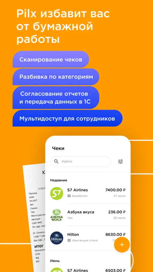 Вам больше не придется вручную собирать чеки со всех сотрудников, использующих средства компании, перепечатывать данные и заниматься бумажной волокитой. Pilx сделает всю рутинную работу за вас и избавит от ручного труда, потерянных чеков и неточных авансовых отчетов.