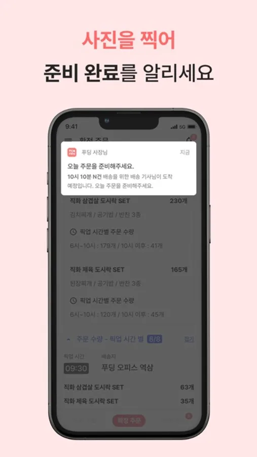픽업 1시간전부터 오늘 주문에 대한 알림이 발송돼요. 알림을 꼭 켜주세요. 혹시나 빠트릴 수 있는 주문 준비, 푸딩이 알려드려요!