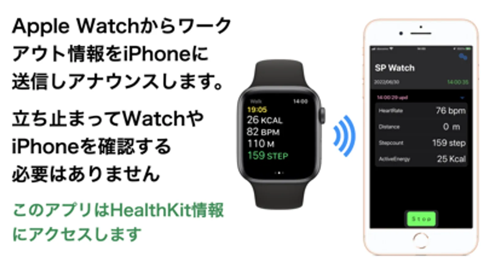 このアプリはHealthkit情報にアクセスします。音声アナウンスを使用するため他の音楽アプリと併用できません