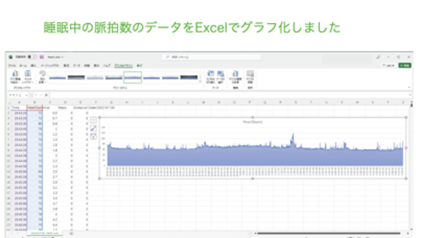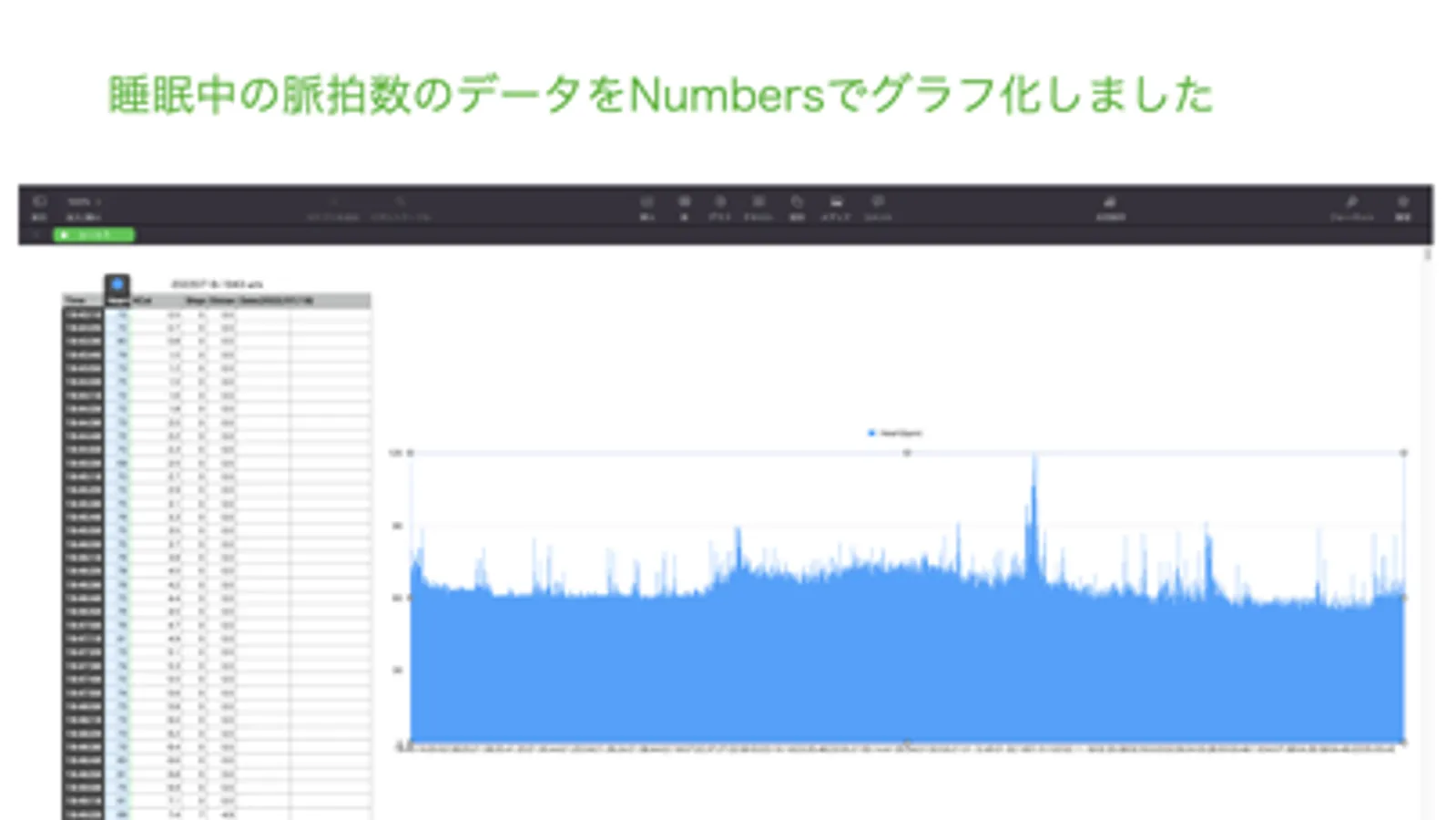 ペア登録しているApple Watchと連携して脈拍数などを継続的に記録します。バックグラウンドでも動作するので睡眠中でも脈拍数の変動を記録できます