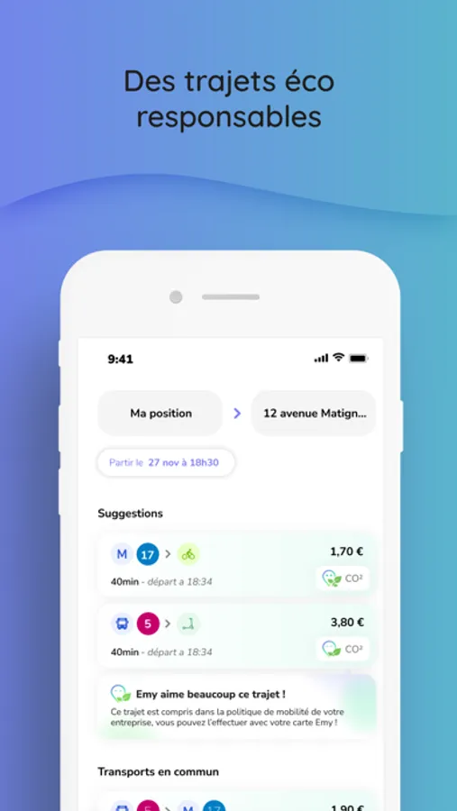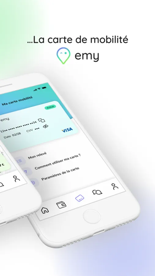 Emy c'est une application de mobilité combinée à une carte virtuelle pour consommer vos budgets mobilités mis à disposition par votre entreprise.