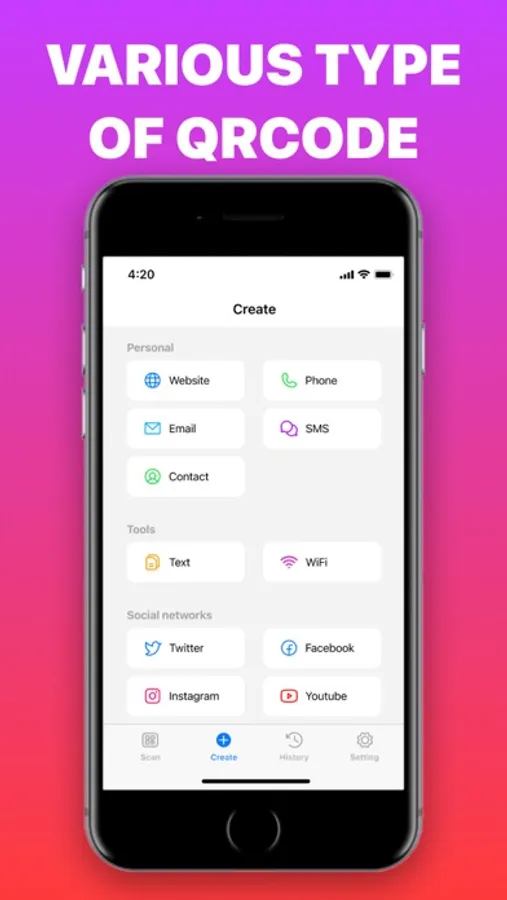 - Create your own QR code with many different fields: website URL, contacts, text, Wifi, Business cards, SMS, and social network accounts,...