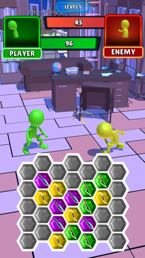 -Your character, your enemy, and a 3D matching puzzle with amazing knife tiles will appear.