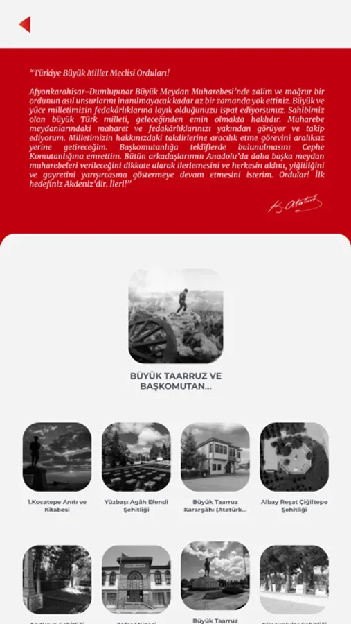 • Buyuk Taarruz guzergahinda yer alan 32 noktanin (sehitlikler, anitlar ve tarihi alanlar) hakkinda detayli tarihi bilgiler ve harita sistemi uzerinden bu alanlarin bulundugu konumlar,