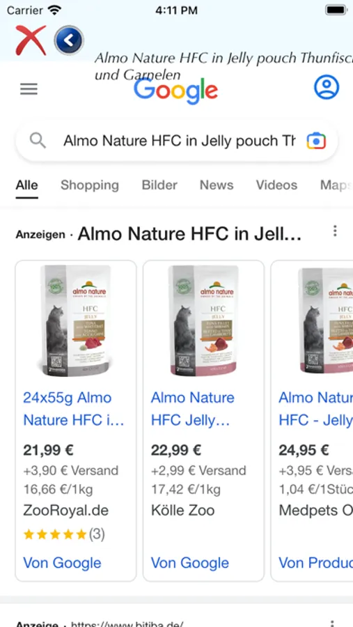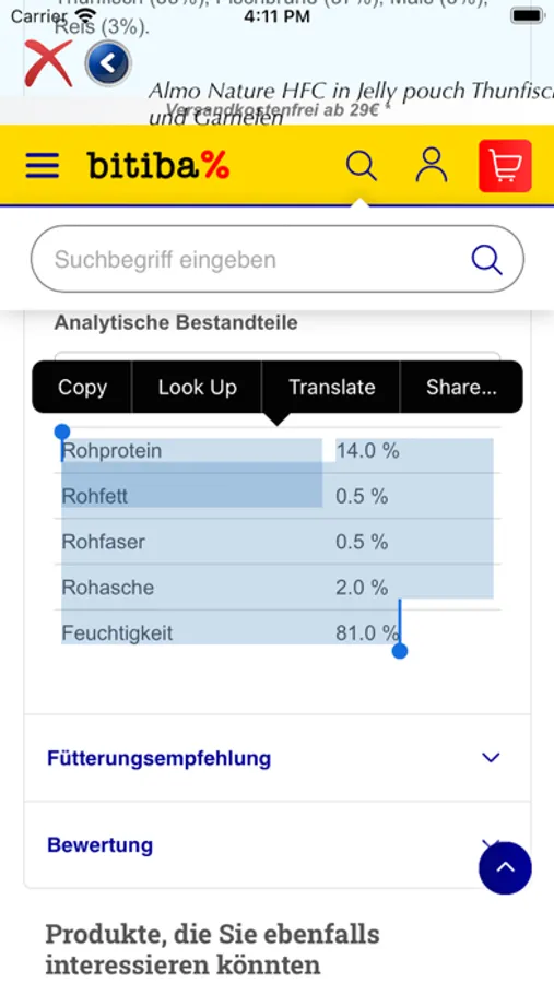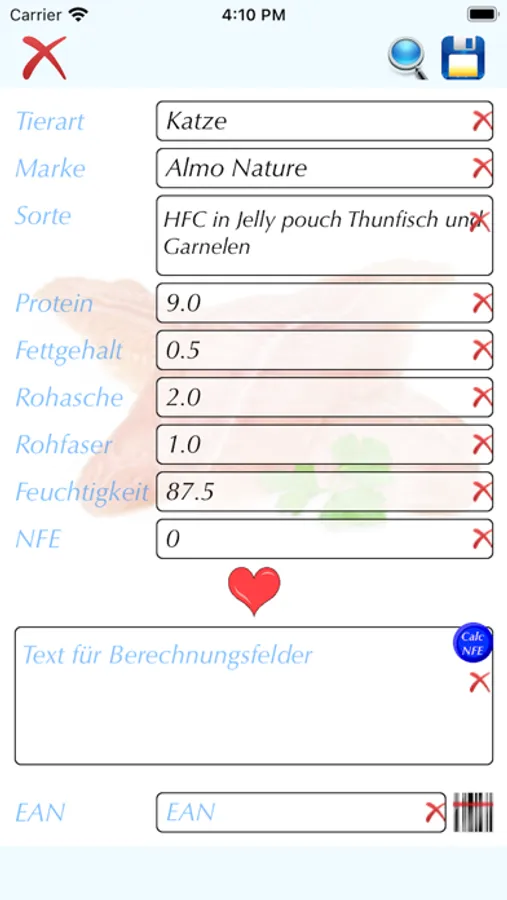 Mit dieser App könnt ihr den Anteil an Kohlehydraten (NFE-Wert) im Katzen- oder auch Hundefutter berechnen. Die Berechnung erfolgt nach der Weender-Analyse. Ca. 180 Sorten an Katzenfutter sind bereits berechnet und hinterlegt, jedoch sollten sie vor dem Kauf nochmal kontrolliert werden, da sich die Zusammensetzung von Futter auch mal ändern kann. Das geht mit dieser App sehr einfach und bequem. Es kann in der App eine Webseite aufgerufen werden, von welcher die analytischen Bestandteile per Copy in ein Feld in der App geschrieben werden. Von diesem Feld aus werden die einzelnen Bestandteile auf die Felder verteilt und berechnet.